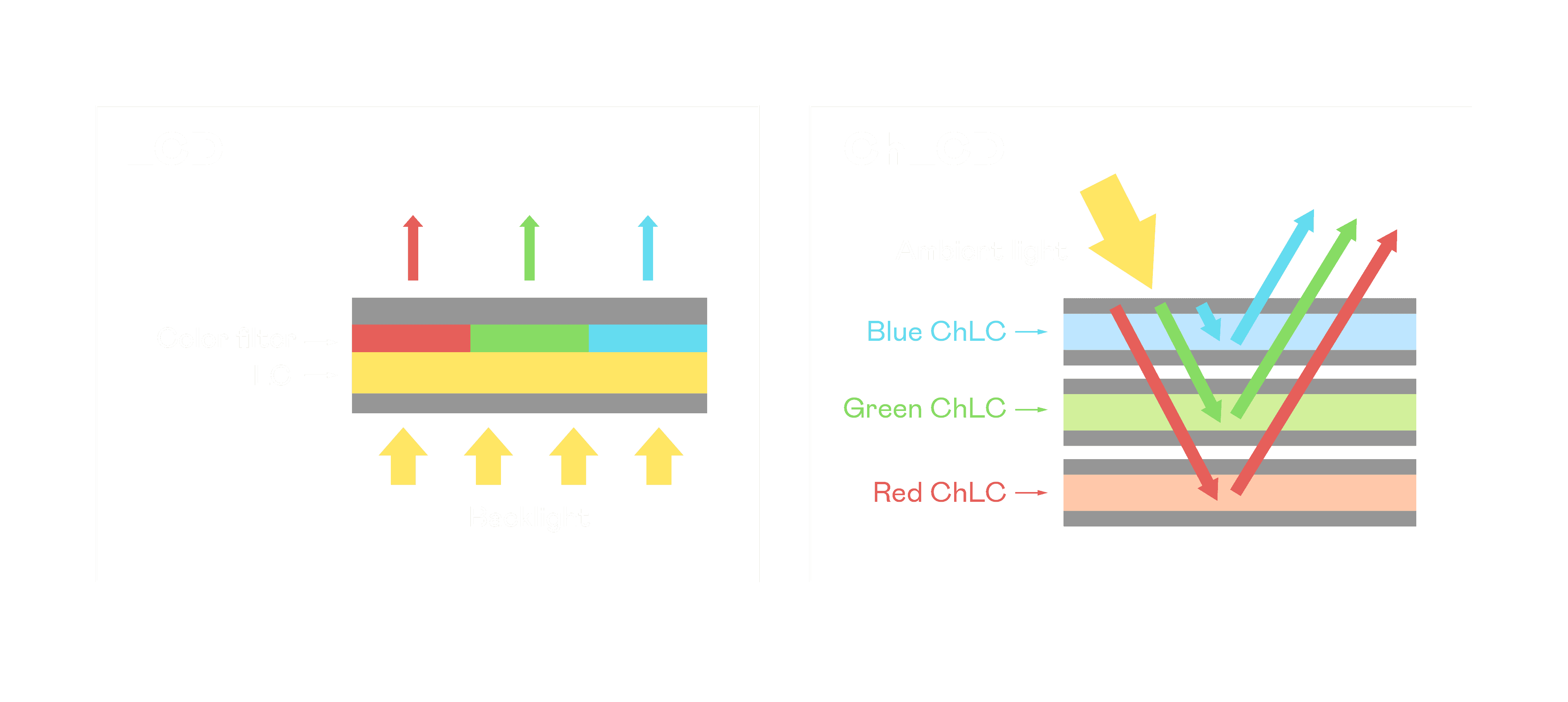 ChLCD 胆固醇液晶就如同纸张一样,,透过反射环境光来显示影像,,因此长时间观看不易造成人眼视觉疲劳,,,可达到护眼效果。。。当处于户外阳光下使用,,LCD 影像容易失真而不易观看,,但胆固醇液晶仍可维持较佳的影像品质。。